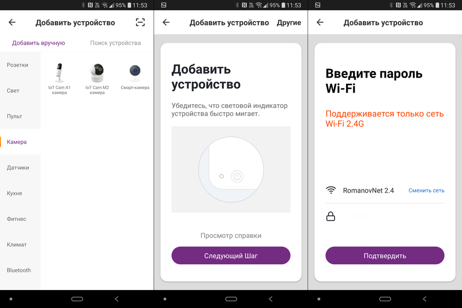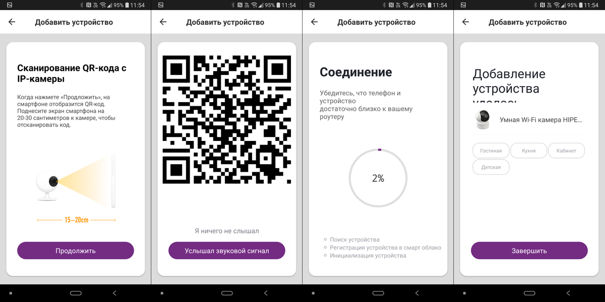 На следующем этапе устройство предлагает отсканировать QR-код, поднеся экран гаджета на расстояние примерно 15-20 см от объектива. Сканируем, ждем чуть меньше минуты — готово. Приложение сообщает о добавлении камеры и сразу предлагает указать ее расположение внутри дома.