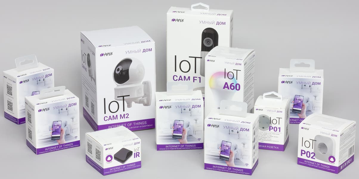 Упакованы камеры, как и все устройства Hiper IoT, в красочно оформленные коробки из картона средней плотности, содержимое которых закреплено с помощью картонных же вставок. На фото ниже они по центру.
