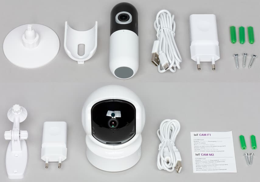 Комплект поставки практически одинаков: сама камера, штатив-кронштейн, двухметровый кабель для зарядки, блок питания, краткая инструкция (русский язык присутствует) и набор для крепежа. Об отличиях поговорим в следующей главе.