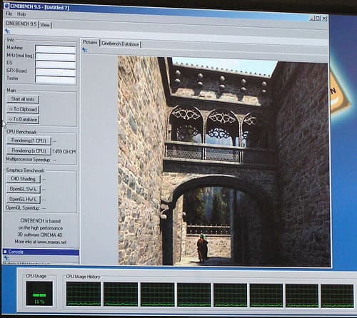 И в качестве подтверждения, что этой дюжиной двухъядерников Intel ограничиваться не намерена, запустил в реальном времени тест рендеринга Cinebench 9.5 на будущей DP-системе из двух четырехъядерных процессоров (Clovertown).