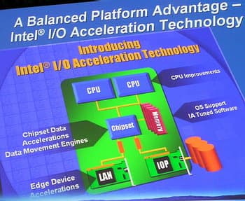 Показал Гелсингер (тоже впервые на публике) и работу развиваемой корпорацией технологии Intel I/O Acceleration. На 6 одновременных гигабодных сетевых потоках под управлением Linux платформа Bensley, оснащенная I/OAT, имела в 2,5 раза меньшую загрузку процессоров — 17% против 40% без нее.