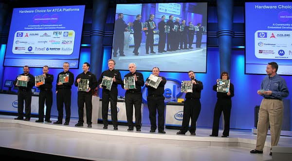 и в буквальном смысле устроил парад платформ ATCA (в том числе, с новейшим двухъядерным процессором Sossaman) в виде эдакого показа мод с дефиле «моделей» под модную музыку.
