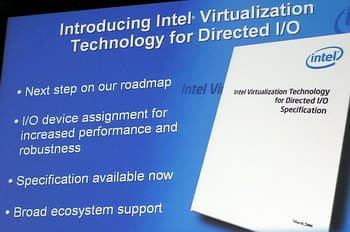 Сорвав этим оглушительные аплодисменты серьезной публики. Далее Гелсингер отметил успешность внедрения технологии виртуализации Intel VT и объявил о втором поколении Intel VT, получившем имя VT for Directed I/O или VT-d. Спецификации на эту технологию стали доступны во время IDF.