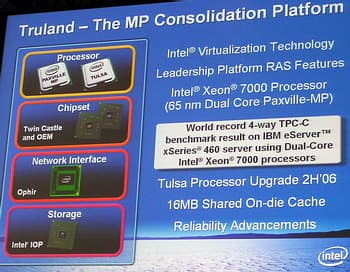 Далее, объявив, что обновление многопроцессорной серверной платформы Truland состоится во второй половине этого года выпуском 65-нм процессора Tulsa с кэш-памятью 16 Мбайт (видимо, самого последнего процессора на архитектуре Intel NetBurst ),