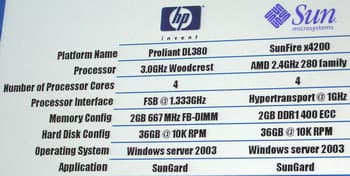 Патрик устроил соревнование между двухпроцессорной системой на двухъядерных Оптеронах (SunFire x4200) возраста примерно начала осени 2005 года и системой HP на платформе Bensley с будущими (в третьем квартале 2006 года) более высокочастотными процессорами Woodcrest (конфигурацию см. на рисунке).
