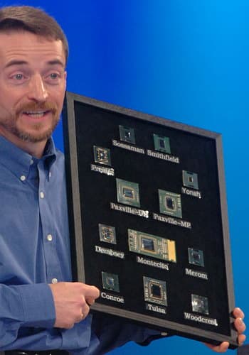 недавно отрастивший стильную бородку, которая одним нравится, а другим почему-то нет. Показав «для затравки» живьем все три ближайших процессора с Intel Core Microarchitecture — Merom, Conroe и Woodcrest, — а также бокс с 300-мм кремниевыми пластинами с этими кристаллами и плату готового сервера на Woodcrest,