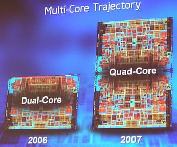 На этом демонстрации, однако, не закончились и Гелсингер продемонстрировал уже 12 фактически готовых двухъядерных процессоров (год назад он показывал лишь 5, см . здесь),