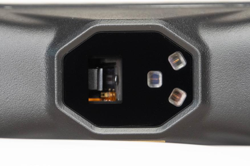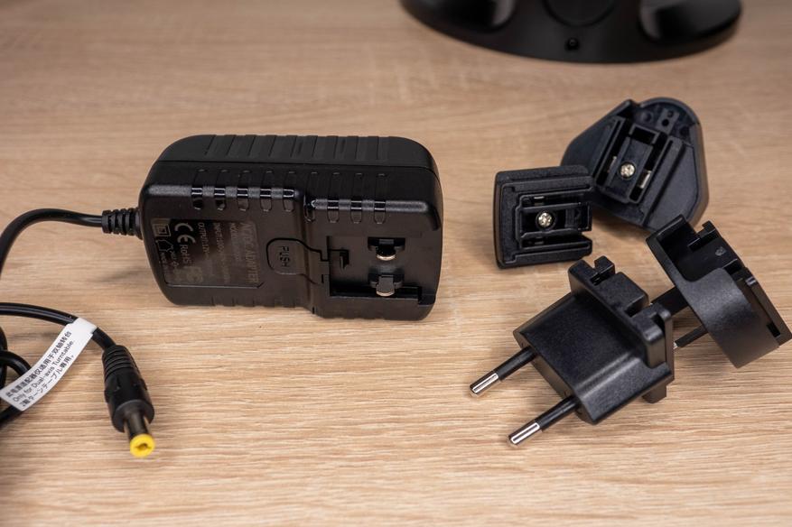 В основании есть прорезиненные ножки, обеспечивающие устойчивость во время работы. Разъем питания расположен сзади, поставляется с блоком 12В 2А. Также есть удобные переходники для разных типов розеток.