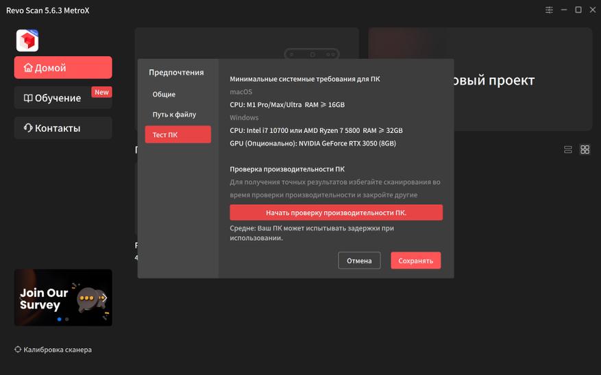 Для новой модели сканера нужно скачать ответвление Revo Scan 5 MetroX. Оно выглядит как и стандартная версия, но немного расширили настройки и добавлен тест производительности ПК. Мой старичок его не провалил, показав среднюю производительность.