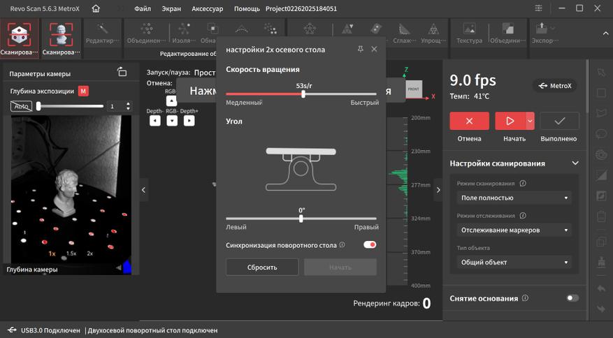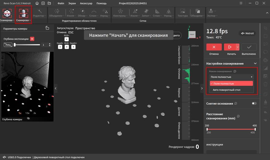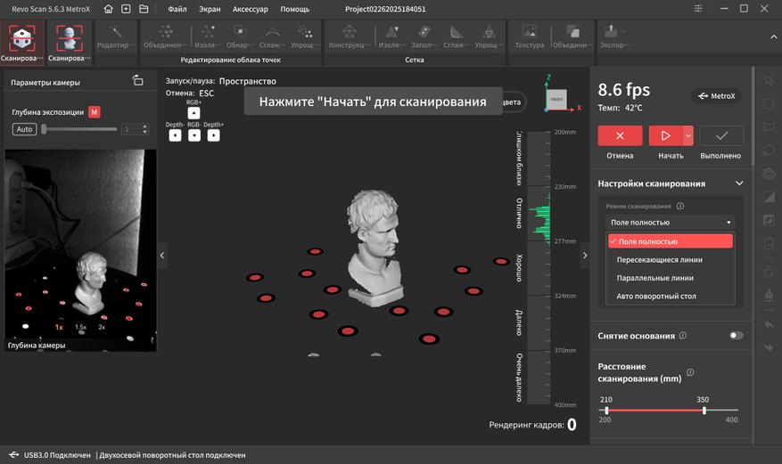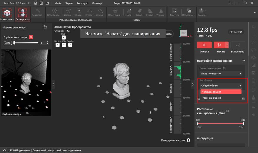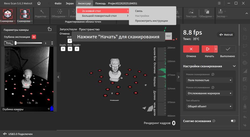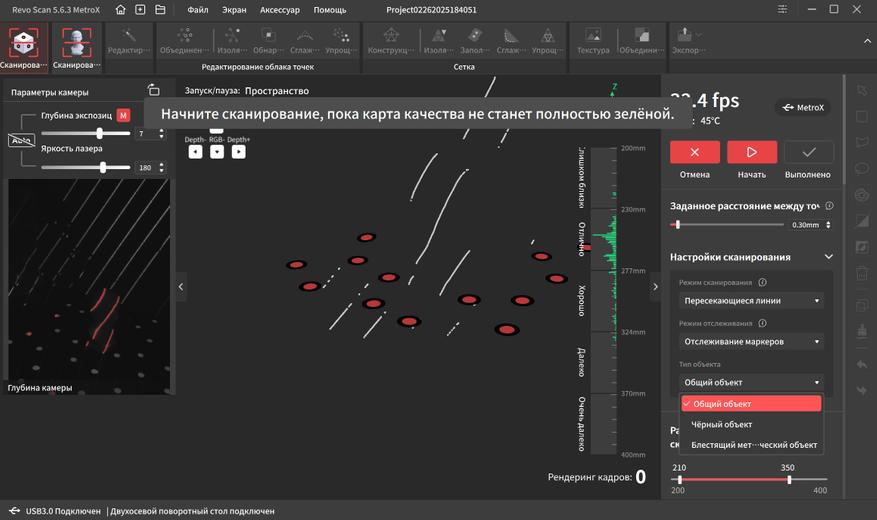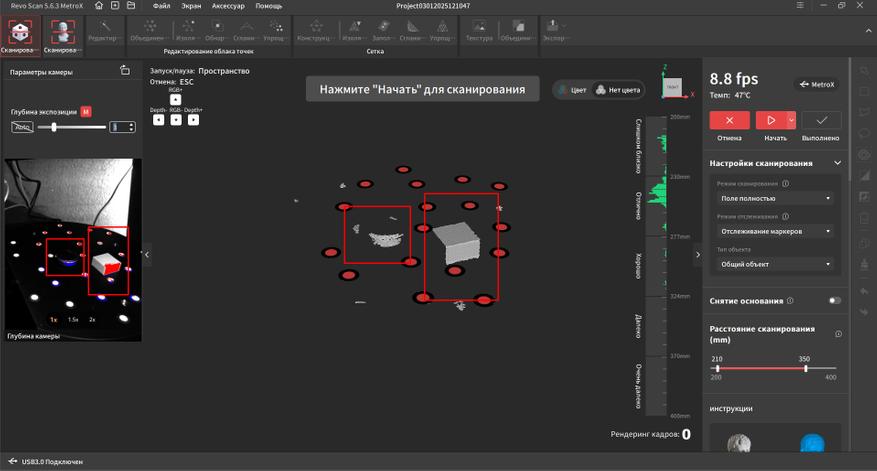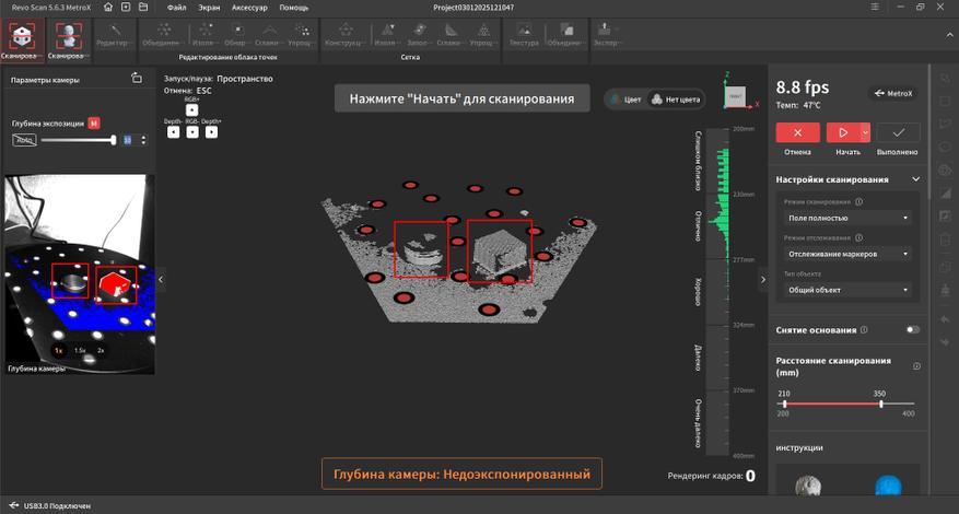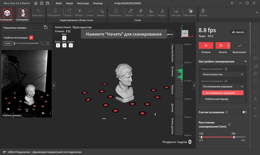 Интерфейс переведен на русский язык и довольно прост в освоении. В верхней части окна находятся основные вкладки, справа дополнительные параметры и инструменты. Самая первая вкладка подразумевает работу с маркерами. Тут можно выбрать один из четырех режимов работы, режим отслеживания, тип объекта, шаг отрисовки, а так же расстояние фокусировки. Это позволяет отсеять лишний шум на заднем плане при сканировании небольших объектов.