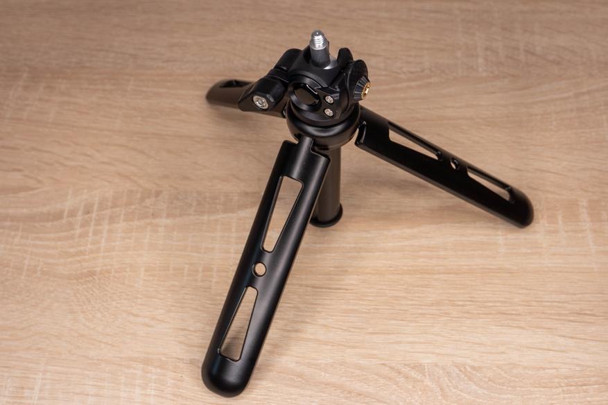 В нижней секции лежал увесистый металлический штатив. Выглядит и ощущается надежно, нет люфта, прорезиненные ножки двигаются с усилием. Для поворота и наклона головы предусмотрен шарнир с фиксатором, сбоку есть стандартная резьба для фиксации дополнительного инструмента. Телескопический механизм позволяет изменять высоту от 17 до 40 сантиметров.