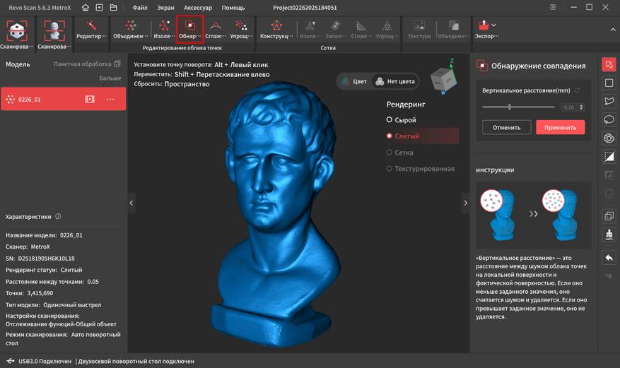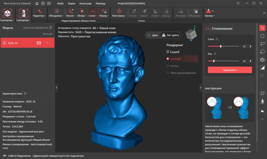 «Обнаружение совпадений» проверяет нет ли наслоений точек на поверхности и под ней. Сглаживание убирает выступающие углы и делает поверхность более плавной, но я редко этим пользуюсь, т.к. мелкие детали так же «съедаются». «Упрощение» уменьшает общее количество точек и увеличивает расстояние между ними. Выручает при сканировании крупных объектов, у которых отсутствуют мелкие детали. После удаления всего лишнего, количество точек снизилось с 10 миллионов до 3 миллионов, так что компьютер без проблем их обработает.