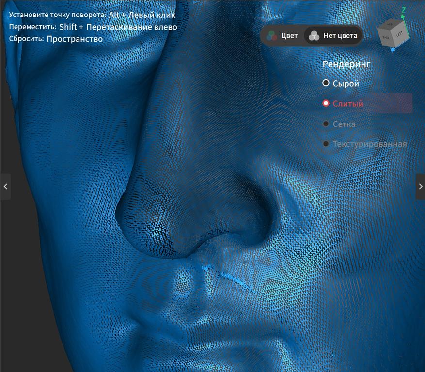 Казалось бы, качество уже неплохое, местами даже видна фактура поверхности, но это по прежнему просто скопление точек, просто довольно плотное. Это становится видно после увеличения.