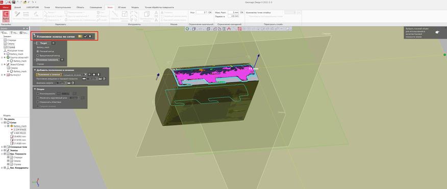 Чтобы получить замкнутую поверхность, необходимо соединить все точки в сетку. Минимальный размер можно выставить до 0.02мм. После этого снова меняются характеристики и вместо точек подсчитываются вершины и многоугольники.