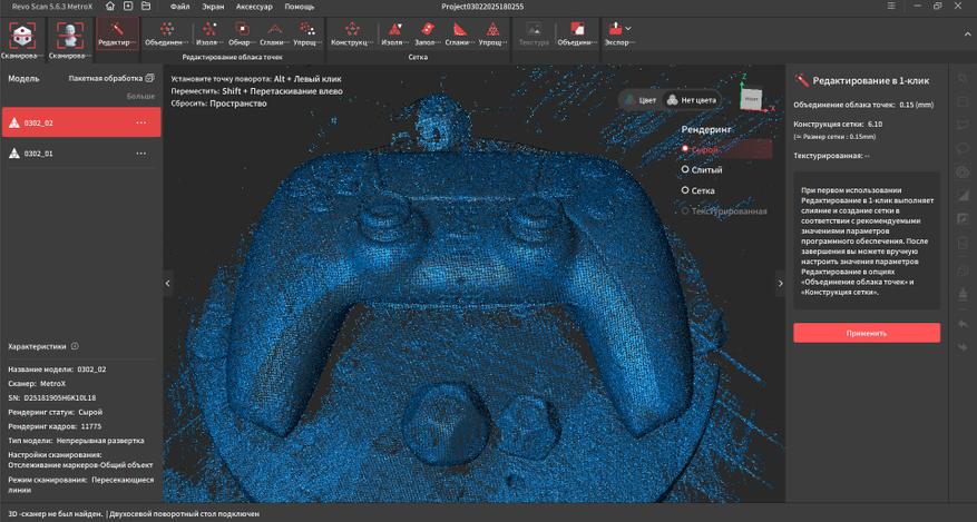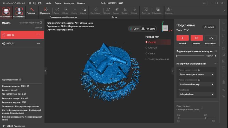 В марте вышло обновление Revo Scan 5 MetroX и приложение научилось нормально использовать GPU, что заметно увеличило производительность в режиме перекрестных и параллельных лазерных линий. На анимации ниже сканирование в реальном времени, гифка даже чуть более дерганная получилась, чем видео.