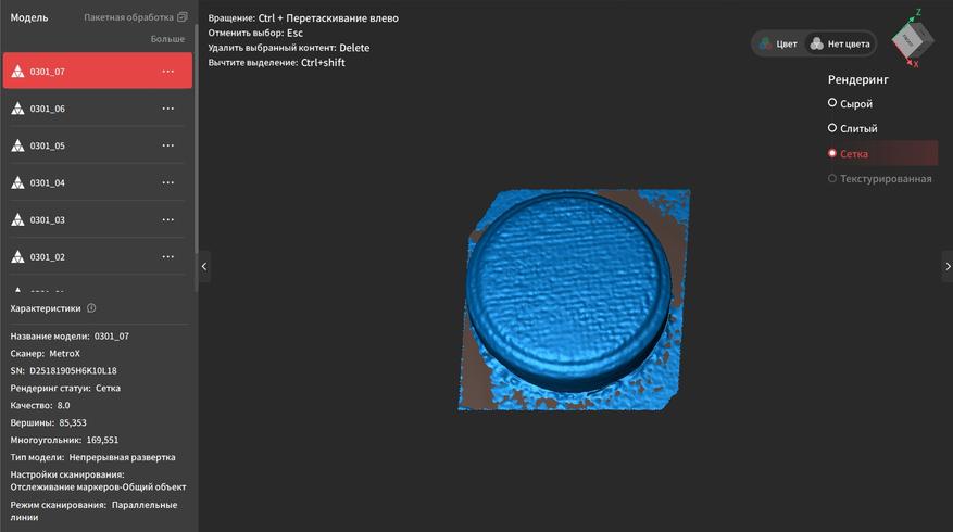 | Детализация одиночного кадра | до 0.01 мм | Форматы выходных файлов | PLY, OBJ, STL, ASC, 3MF, GLTF, FBX |