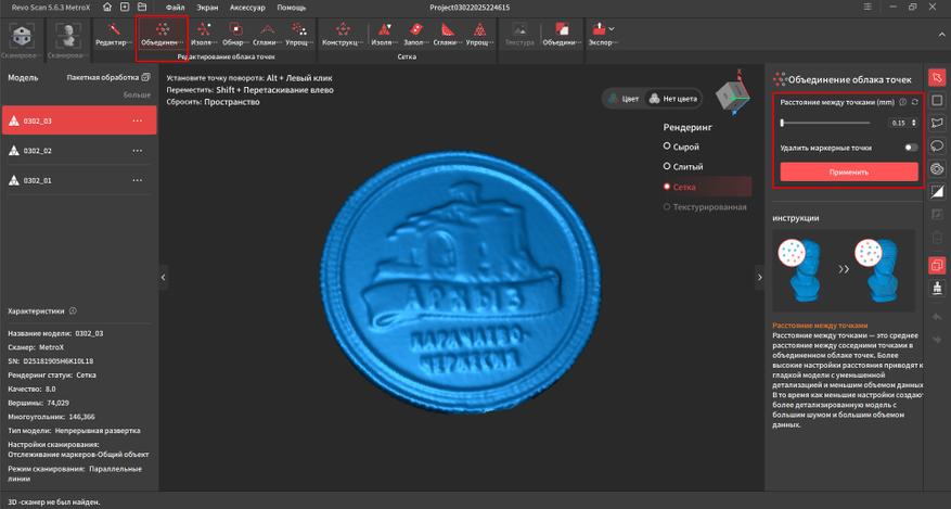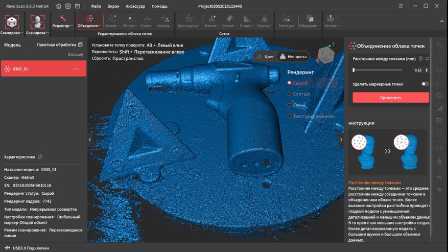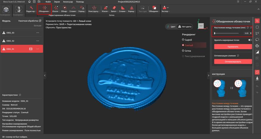 Далее нам нужно объединить облако точек этих кадров. Я поставил минимальное расстояние между точками 0.05мм, чтобы получить максимальную детализацию. После этого в характеристиках вместо кадров начали отображаться точки, которых сформировалось более 10 миллионов.