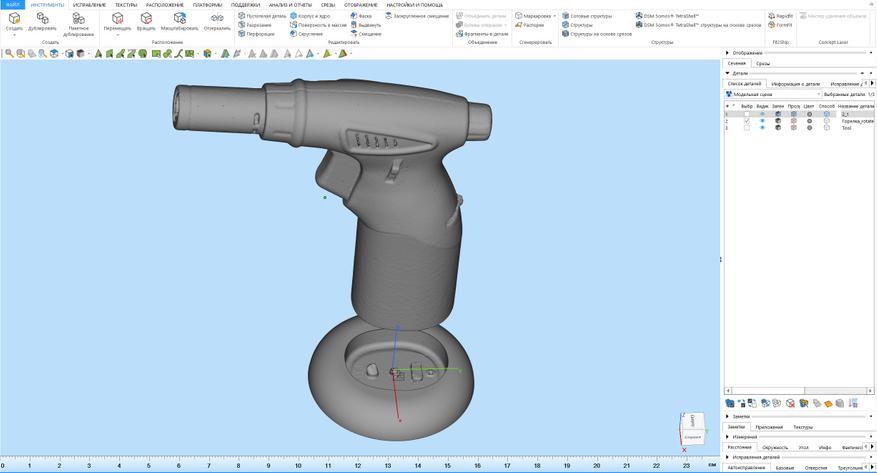 • В режиме перекрестных или параллельных лазерных линий можно без проблем сканировать тёмные и блестящие объекты без матирования, но в этом случае позиционирование работает только по маркерам(я бы рекомендовал использовать глобальные). Из минусов: нельзя использовать цветную камеру для получения текстуры, повышенные требования к ПК для комфортного сбора данных и итоговая детализация модели получается немного ниже, чем при использовании структурированного света. При этом точность особо не страдает, так что данный режим вполне имеет право на жизнь если у исходного объекта нет очень мелких деталей.
