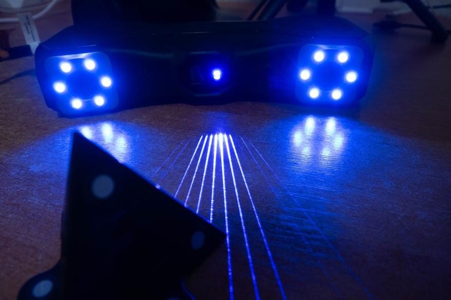 • В режиме структурированного света обеспечивается максимальная точность и детализация, при этом не требуется больших вычислительных мощностей, так что для сбора данных и обработки подойдет средний по мощности компьютер или ноутбук со встроенной видеокартой. А еще есть отдельная опция сканирования с упором на геометрию, а не маркеры и возможность считывать цвет и накладывать текстуру на модель. Из минусов только проблемы со сканированием темных и блестящих поверхностей, их придется матировать подручными средствами или специальными составами.