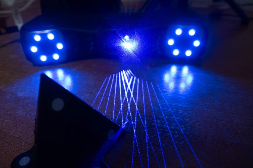 Давайте сразу рассмотрим все типы подсветки. В первом случае это структурированный свет прожектора, во втором 14 перекрестных линий двух лазеров для увеличения скорости отрисовки, а в третьем 7 параллельных одного излучателя для получения лучшего качества и точности.