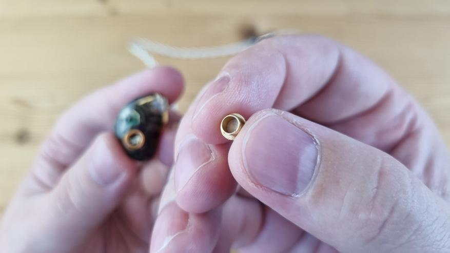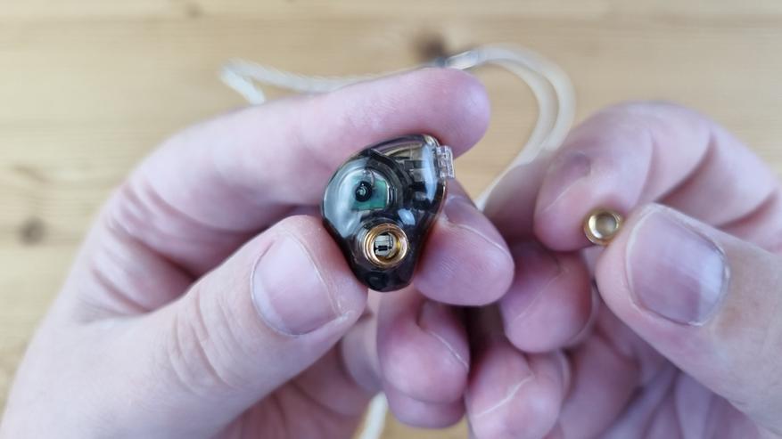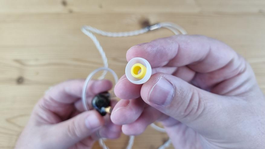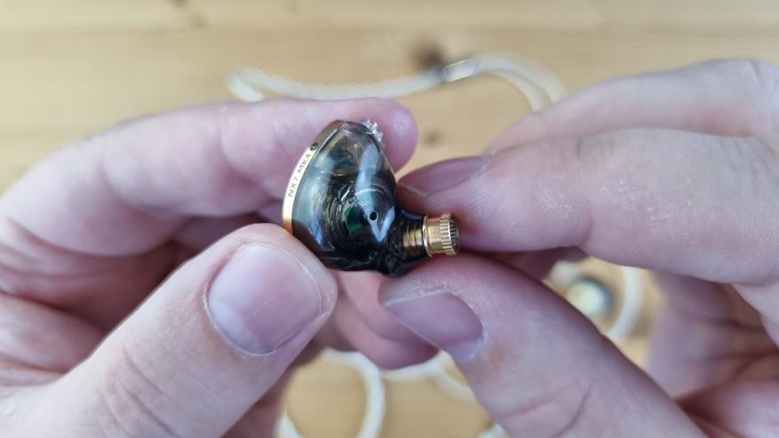 Золотые звуководы, накрученные нам из коробки, тоже дают глубокий динамический бас и по-аналоговому теплую и очень подробную серединку, однако на самом верху с ними есть небольшая заглушенность и неестественно звучащая резкость, негативно влияющая, например, на верхние регистры женского вокала. Да, всё не так плохо, как у 7Hz Five, однако назвать этот звук взрослым или серьёзным лично у меня язык не повернется. С черными насадками приходит басхедность, и сам звук этим как бы уравновешивается.