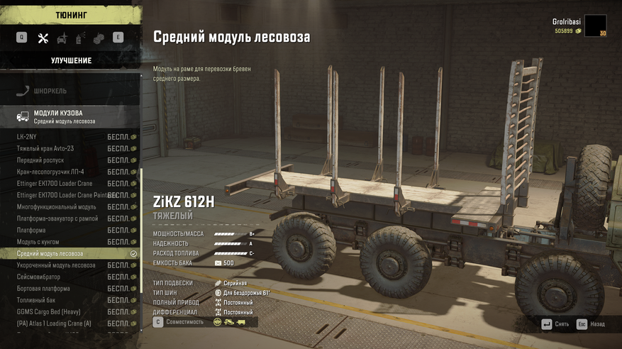 Вот, например, для средних брёвен есть возможность перевозить их на раме грузовика и/или в прицепе. Модуль для перевозки средних брёвен ставится в гараже. Читайте описание внимательно! В модуль для средних не получится загрузить короткие, обратное тоже верно. Некоторые грузовики после установки модуля способны также возить прицеп, но таскать ещё и прицеп — не лучшая затея. Во-первых, как сказано выше, брёвна — один из самых тяжёлых грузов, а тяжелее одной пачки такого груза может быть только одна пачка в модуле и вторая пачка на прицепе. Не каждый грузовик способен вытянуть такую тяжесть. Но брать слишком тяжёлый транспорт и чрезмерно упрощать себе геймплей тоже не хочется. Так и получается, что самым правильным решением будет погрузка брёвен исключительно в модуль для них, тогда и прицеп не придётся покупать/продавать. Грузить брёвна только на грузовик полезно ещё и тем, что в случае опрокидывания придётся меньше собирать.