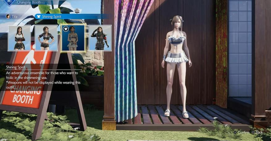 В 6 главе вы впервые получите возможность менять внешний вид персонажей. Для доступа к пляжу необходимо переодеть всех героев в соответствующие наряды. Купоны на приобретение нарядов можно получить за участие в мини-играх, расположенных в Costa del Sol. Чтобы по итогу смены костюмов получить + к отношениям с Тифой, необходимо выбрать Клауду и Тифе наряды в одном стиле. Таким образом, если Клауд носит Wild Surf, то Тифу одеваем в Shining Spirit. Если Клауд одет в Ocean Chocobo, то Тифе выбираем Majestic Glamour.