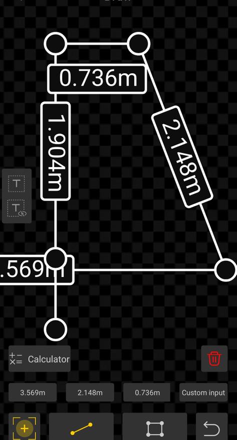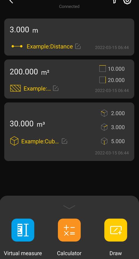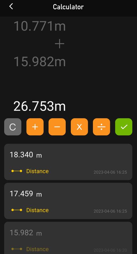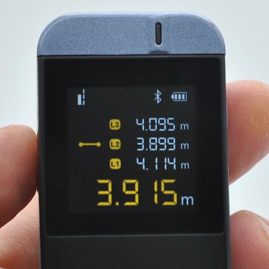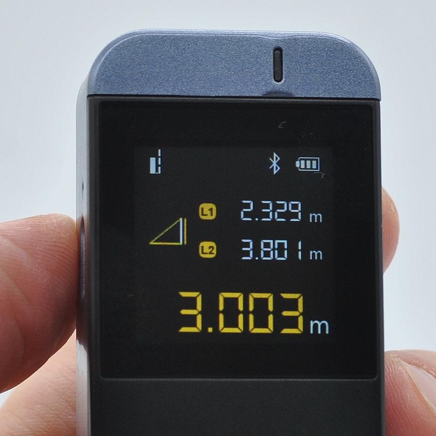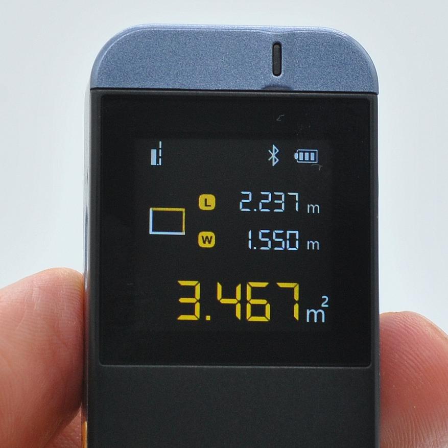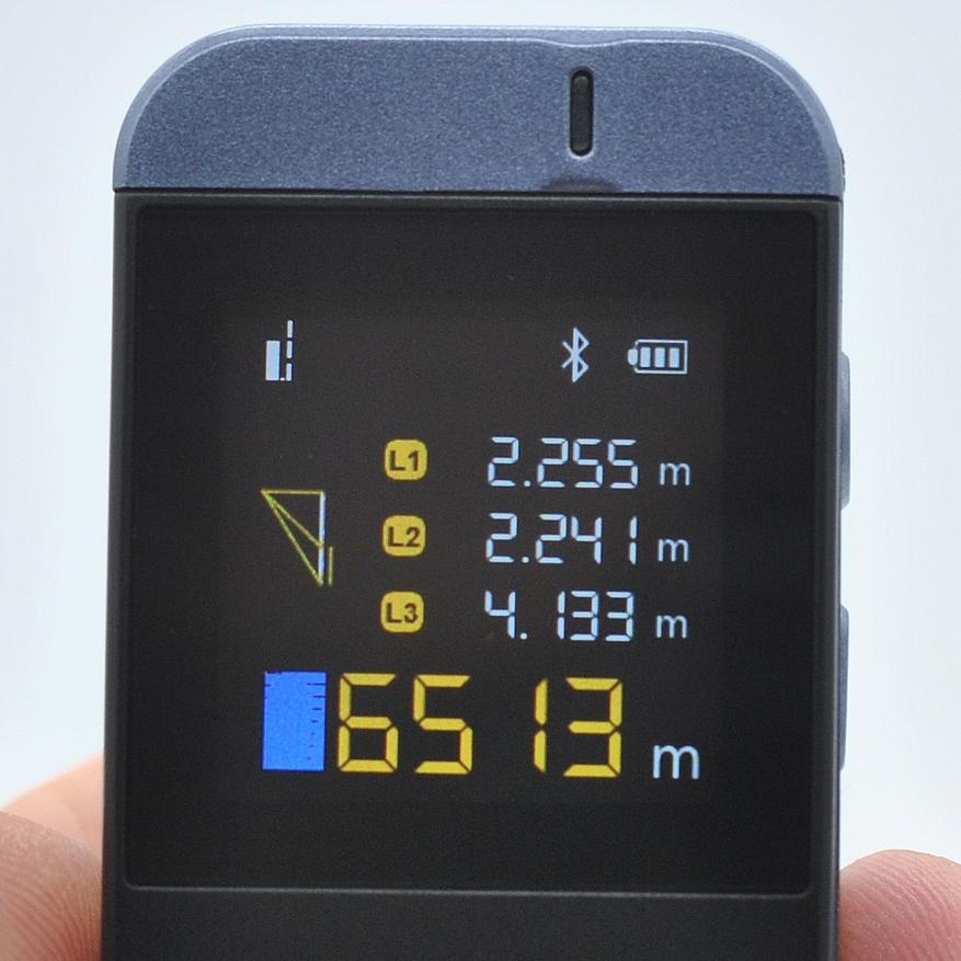 Экран в режиме линейных измерений (по умолчанию) отображает три прошлых измерения и текущее, место отсчета (задний торец или передний), индикатор Bluetooth и заряда аккумулятора. Уровня нет. Экран поворачивается по кругу на 90 градусов, по сигналу датчика положения. Причем делает это без тормозов, это порадовало, но можно и отключить эту возможность. Углы обзора и четкость изображения хорошие.