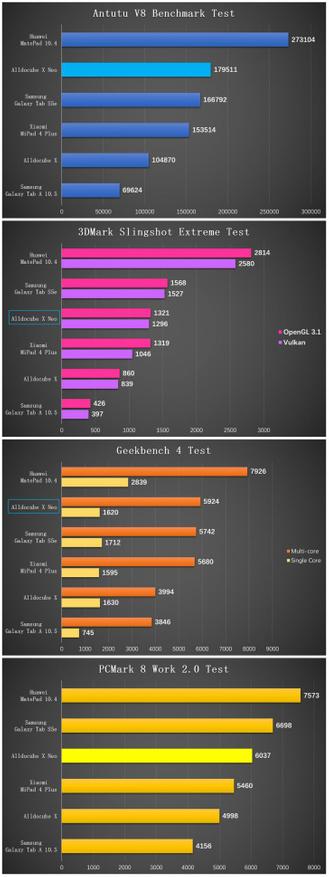 Alldocube X Neo оснащен процессором AIE Qualcomm Snapdragon 660 (4 ядра Cortex-A72 с тактовой частотой 2,2 ГГц и 4 ядра Cortex-A53 с тактовой частотой 1,8 ГГц) и графический процессор Adreno 512. Этот набор микросхем был выпущен в далеком 2017 году и основан на 14-нм техпроцессе, относительно устаревший и не сравнится с производительностью Snapdragon 675 или Kirin 810, которые есть во многих бюджетных смартфонах Android. Но по сравнению с 28-нм процессором MediaTek 8176 в Alldocube X, это все же серьезное обновление.