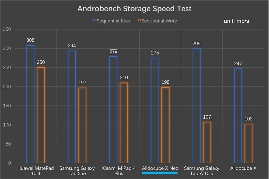Встроенное хранилище — eMMc 5.1, которое конечно не сравнится с хранилищами UFS, но X Neo в тесте Androbench удалось получить результаты скорости работы с памятью, не хуже чем в более дорогих планшетах среднего класса, таких как Samsung Galaxy Tab S5e.