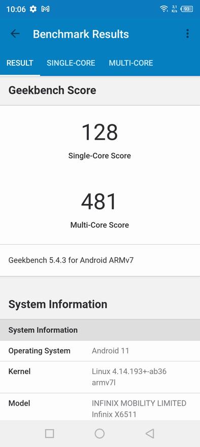 В качестве SoC используется довольно бюджетный Unisoc SC9863A построенный по 28nm тех.процессу. В качестве структуры применяется связка из 4 ядер Cortex-A55 (1.6GHz) и 4 ядер Cortex-A55 (1.2GHz). Посмотрим на их результаты в синтетических тестах: