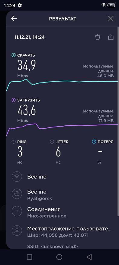 В качестве модема выступает Spreadtrum SPRD SC9610, который почему-то не может выбрать заявленную провайдером скорость 100MB в тестах WiFi, показывая результат в 35 и 43MB/s. При этом данный SoC не поддерживает частоту 5GHz, тем самым упираясь в загруженный эфир.