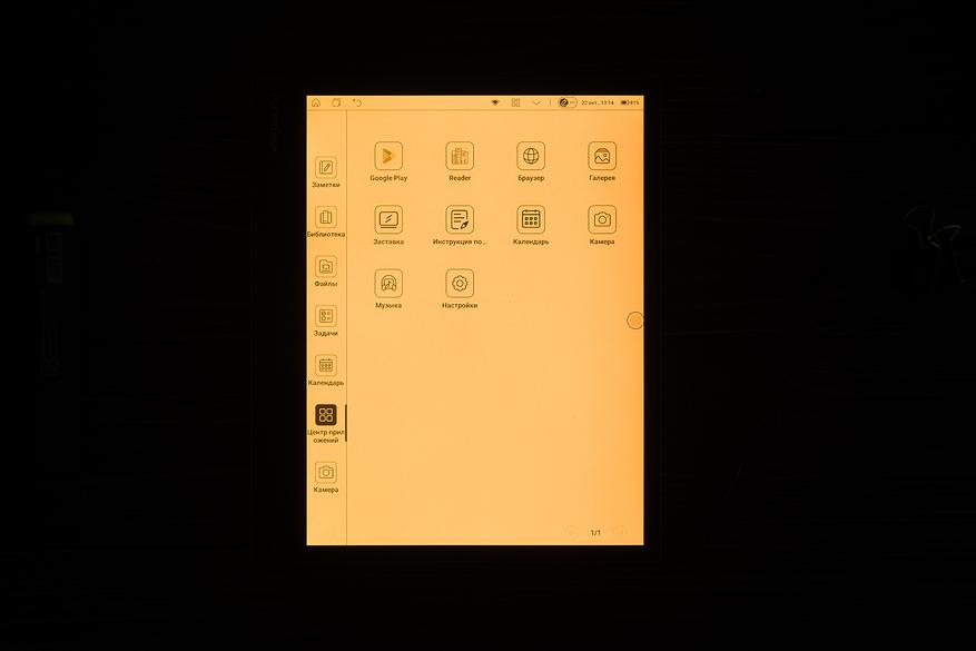 Подсветка реализована на стандартном для современных ридеров уровне — есть как опция изменения яркости, так и опция регулировки цветовой температуры. Нюанс в том, что даже если передвинуть ползунок в самую левую часть шкалы оттенка, свет будет не белым, а желтоватым. Сдвигаем вправо — и он почти сразу становится оранжевым, ну и дальше по мере сдвигания ползунка он превращается уже совсем в апельсиновый. А вот чистого белого света, по сути, и нет. Меня это нисколько не раздражает — я всегда делаю подсветку экранов ридеров чутка желтоватой, так она получается более «ламповой». Но кому-то отсутствие белого может и не понравиться.