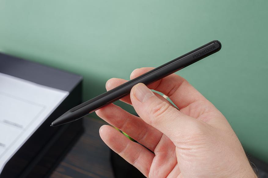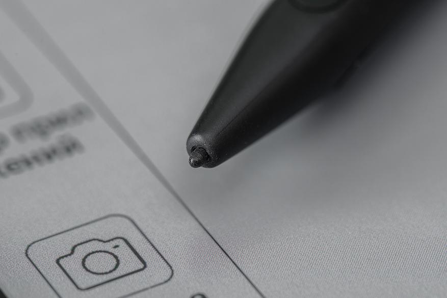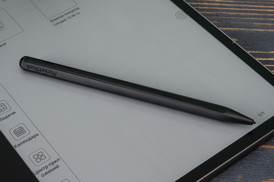 Стилус сделан из пластика. Он достаточно толстый, но при этом легкий. Зарядки не требует. Каких-либо клавиш на перышке нет. Примагничиваться к корпусу ридера он не умеет, что, наверное, можно записать в минусы.