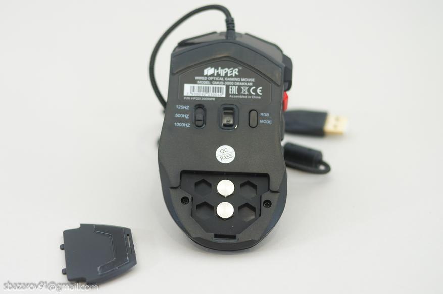 В нижней части расположены пара крупных тефлоновых ножек для скольжения мышки, окошко оптического сенсора, тумблер переключения частоты отклика и смена режимов подсветки.