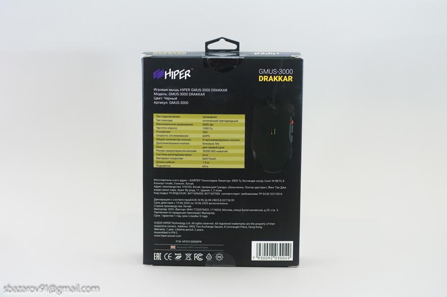 Игровая мышь HIPER DRAKKAR GMUS-3000 поставляется в плотной картонной коробке с яркой полиграфией и изображением внешнего вида «грызуна», а также его особенностей. На обороте подробные технические характеристики.