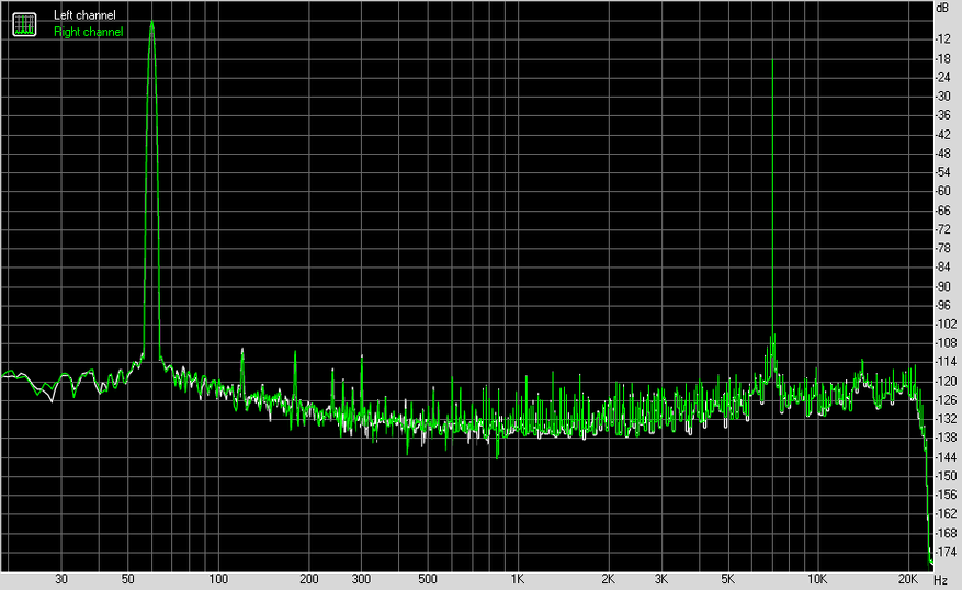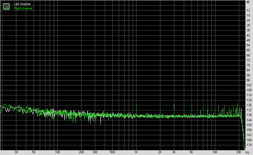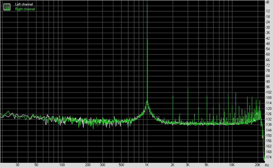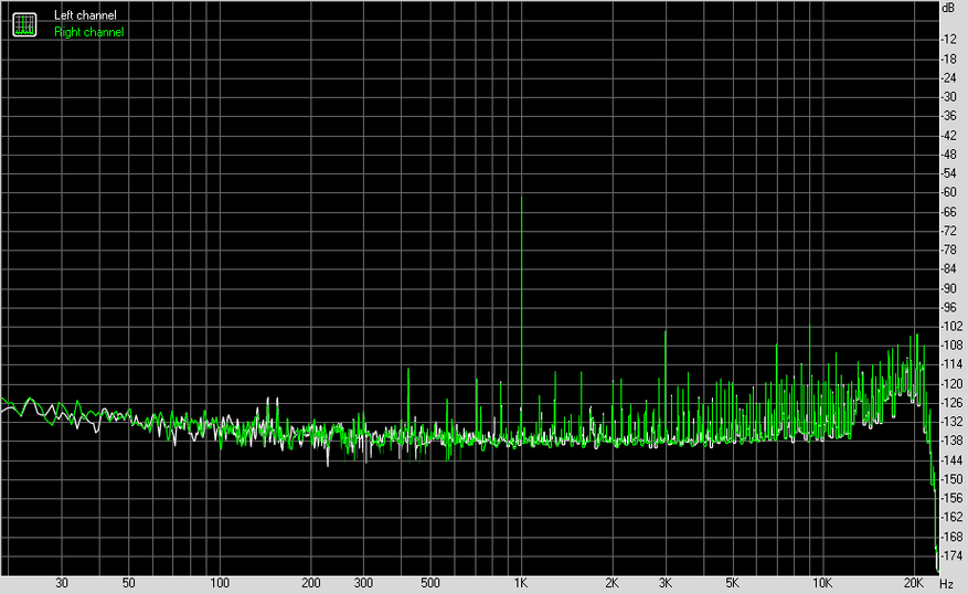 АЧХ, как видите, вполне нормальная, достойный уровень шумов, неплохой динамический диапазон и искажения, для гармонических достигающие минус 98 дБ, то есть около 0.003%, а для интермодуляционных — около минус 109 дБ.