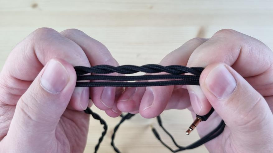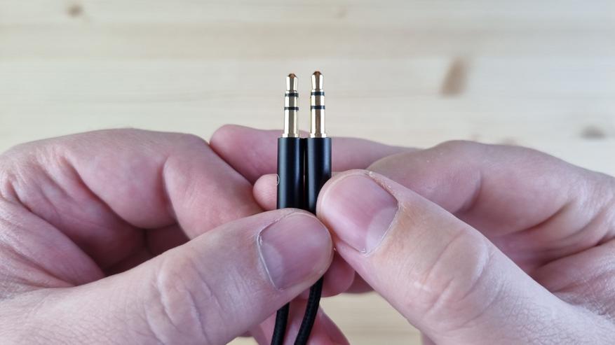 В комплекте была инструкция и скромно выглядящий кабель в матерчатой оболочке. Штекер у него L-образный, а коннекторы — на классических 3.5 мм разъемах. То есть с подбором кабеля подороже проблем быть не должно. Ну и по сопротивлению тут вполне допустимые 0.2 Ома.