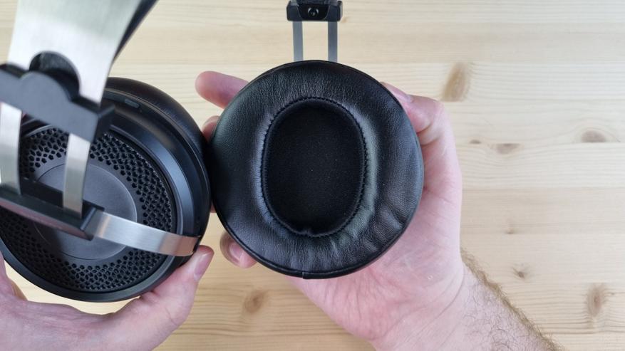 Чашечки, как я уже упомянул, имеют полуоткрытую конструкцию, с отверстиями для компенсации и подключения кабеля, пластиковой внешней частью и очень вместительными амбушюрами из кожзаменителя.