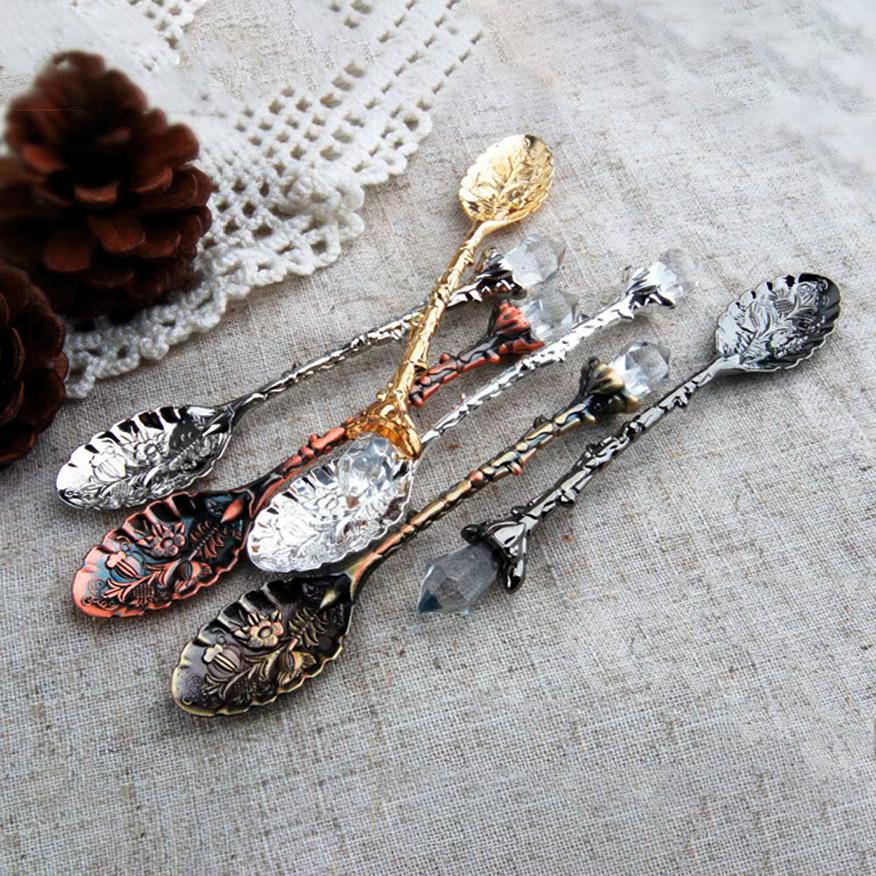 Поклонникам фэнтези-вселенных придутся по душе ложки в средневековом стиле. Каждая выполнена вручную с особым вниманием к деталям — витиеватые узоры на черенке плавно переходят в рабочую часть, а навершие украшено искусно ограненным стеклянным кристаллом. Грубоватая текстура металла придаёт изделиям особый шарм, напоминающий о древних артефактах.