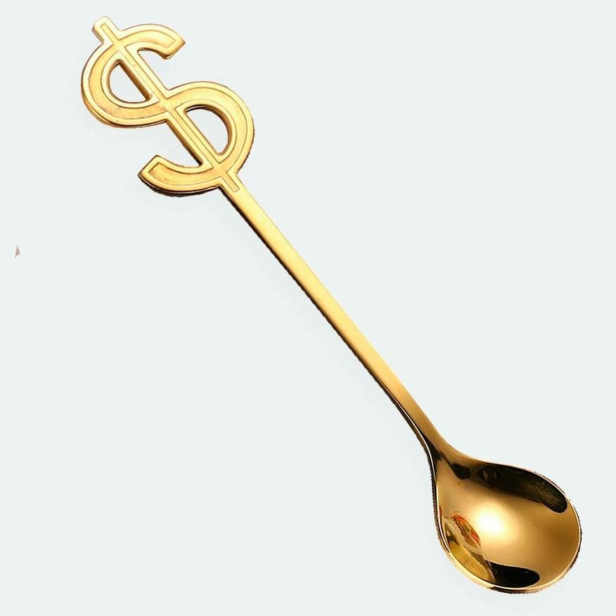 Юмористический подход к теме финансов воплотился в наборе из двух золотистых ложек с ручками в форме значка американского доллара. Комплект поставляется в подарочной коробочке с прозрачным окошком, через которое виден благородный блеск металла. Рельефный рисунок на черенках детально повторяет элементы знаменитой банкноты.