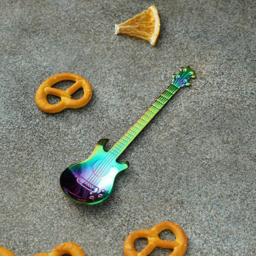 Любителям музыки придётся по вкусу ложка, стилизованная под электрогитару. Дизайнеры постарались максимально точно передать характерные черты музыкального инструмента: от изгибов корпуса до имитации грифа на ручке. Особого внимания заслуживает уникальное «бензиновое» покрытие, создающее переливающийся эффект и довершающее образ.