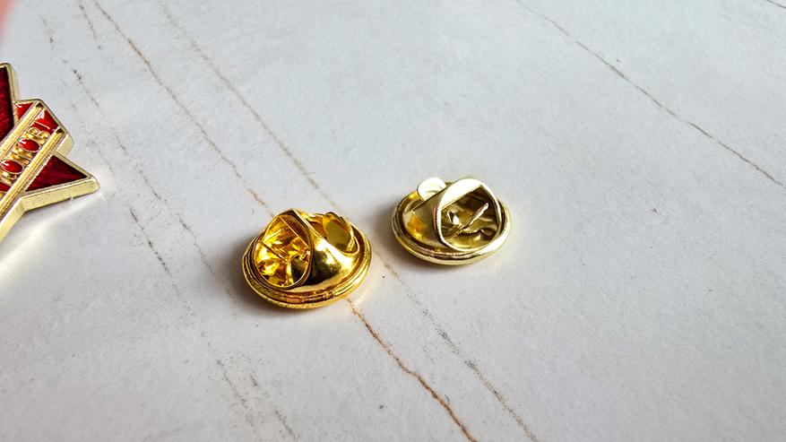 От проворачивания, имеются два дополнительных штырька. Которые неплохо держат значок в одном положении.