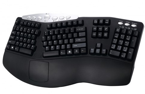 Удобное положение рук обеспечивается изогнутой формой клавиатуры и разделением основного блока клавиш. Для снижения нагрузки также служит встроенный упор для кистей рук.