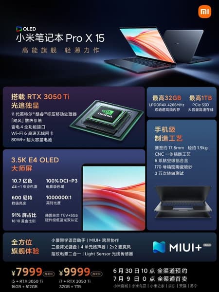 В Китае с сегодняшнего дня можно оформить предзаказ на Mi Notebook Pro X 15, реальные продажи стартуют 9 июля. Стоимость базовой версии в пересчёте на рубли — 92 000, топовой — 115 000.