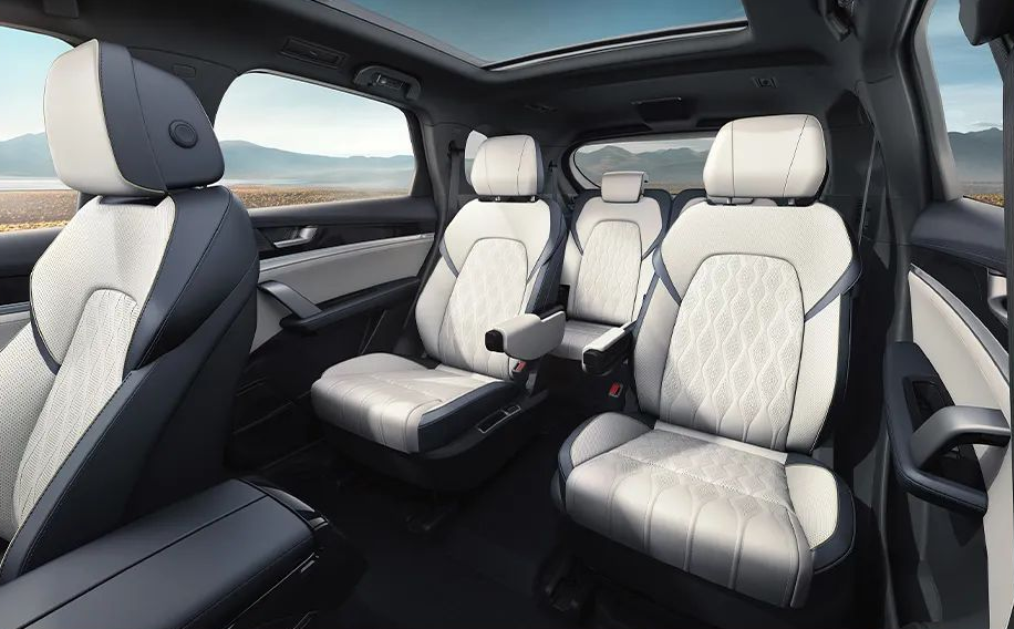 Внутри BYD Tang DM-p — шесть раздельных кресел с отделкой кожей Nappa, вентиляцией и обогревом (на выбор будет предложен и семиместный вариант), большой дисплей на передней панели и ещё экран поменьше в виртуальной комбинации приборов, множество различных ассистентов вождения, большой панорамный люк.