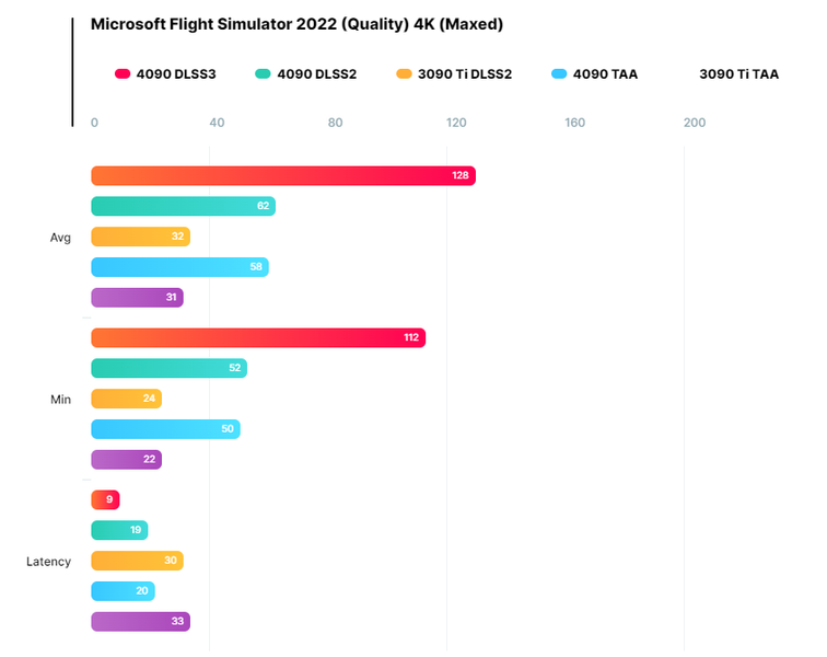 Игра Microsoft Flight Simulator стоит особняком, так как из-за своей высокой процессорозависимости DLSS 2 тут эффекта не имеет. А вот DLSS 3 позволяет поднять производительность более чем вдвое.
