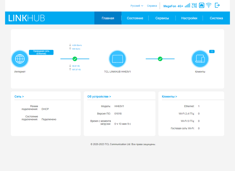 Страница «Главная» используется для оценки текущего состояния системы. Здесь мы видим режим подключения к интернету, текущие скорости приема и передачи данных, некоторую информацию об устройстве, а также число клиентов на разных интерфейсах. Часть элементов страницы является гиперссылками на соответствующие пункты меню.