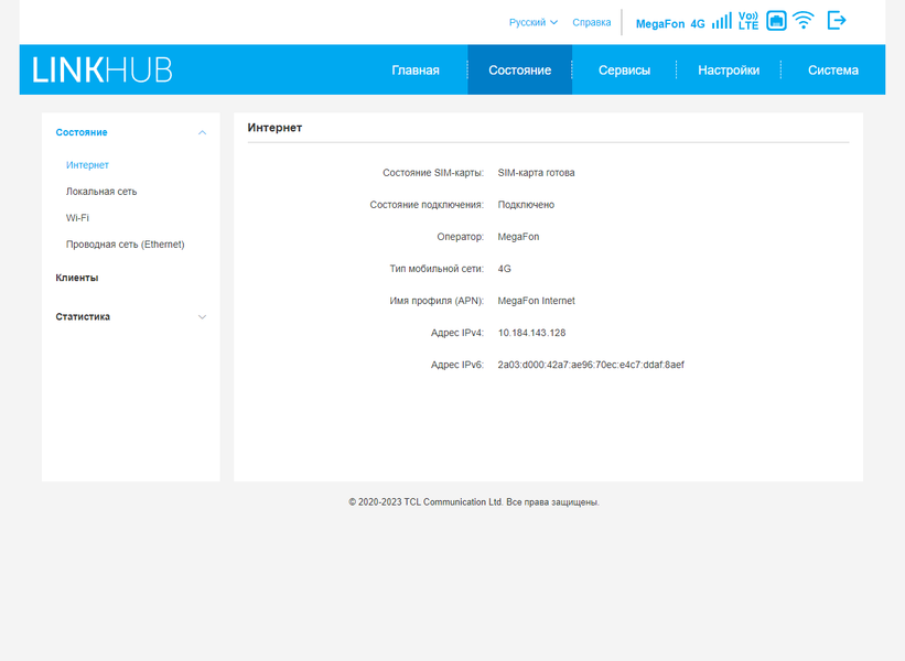 В разделе «Состояние» можно получить подробную информацию об интерфейсах — сотовой сети, локального сегмента сети, Wi-Fi, подключения к провайдеру по кабелю. На странице «Клиенты» представлены данные о них с указанием интерфейса подключения, MAC- и IP-адреса, а также времени работы. Здесь же есть кнопка оперативной блокировки клиента.