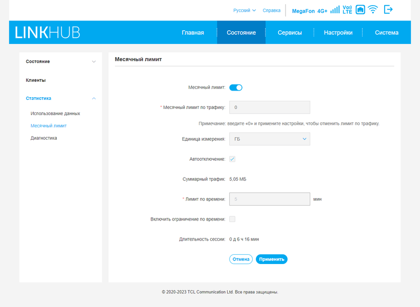 Раздел статистика может быть полезен, если сотовый оператор предоставляет тариф с ограничением трафика. Здесь собраны данные по объемам, можно установить ограничение на месяц или на время работы. Страница «Диагностика» показывает подробные данные о подключении к сотовой сети, включая соту, уровни сигналов, диапазоны и так далее.